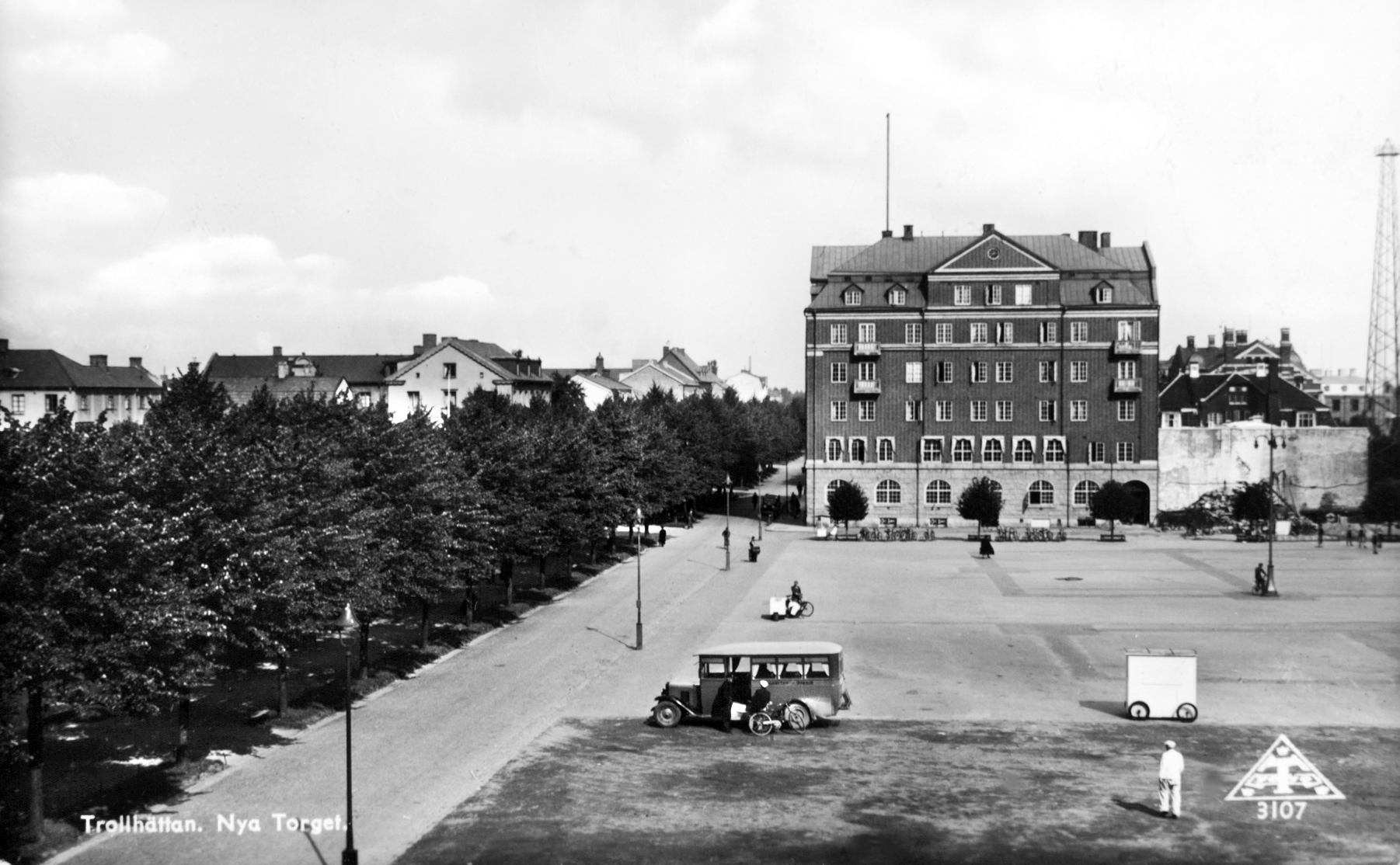 Here was first an inn which in 1869 was replaced by the Grand Hotel. This was demolished in 1913 to make room for a city hall that would be ready when Trollhättan received city rights, which happened in 1916. Then the market trade also moved from Karl-Johan's square to the newly built Drottningtorget.