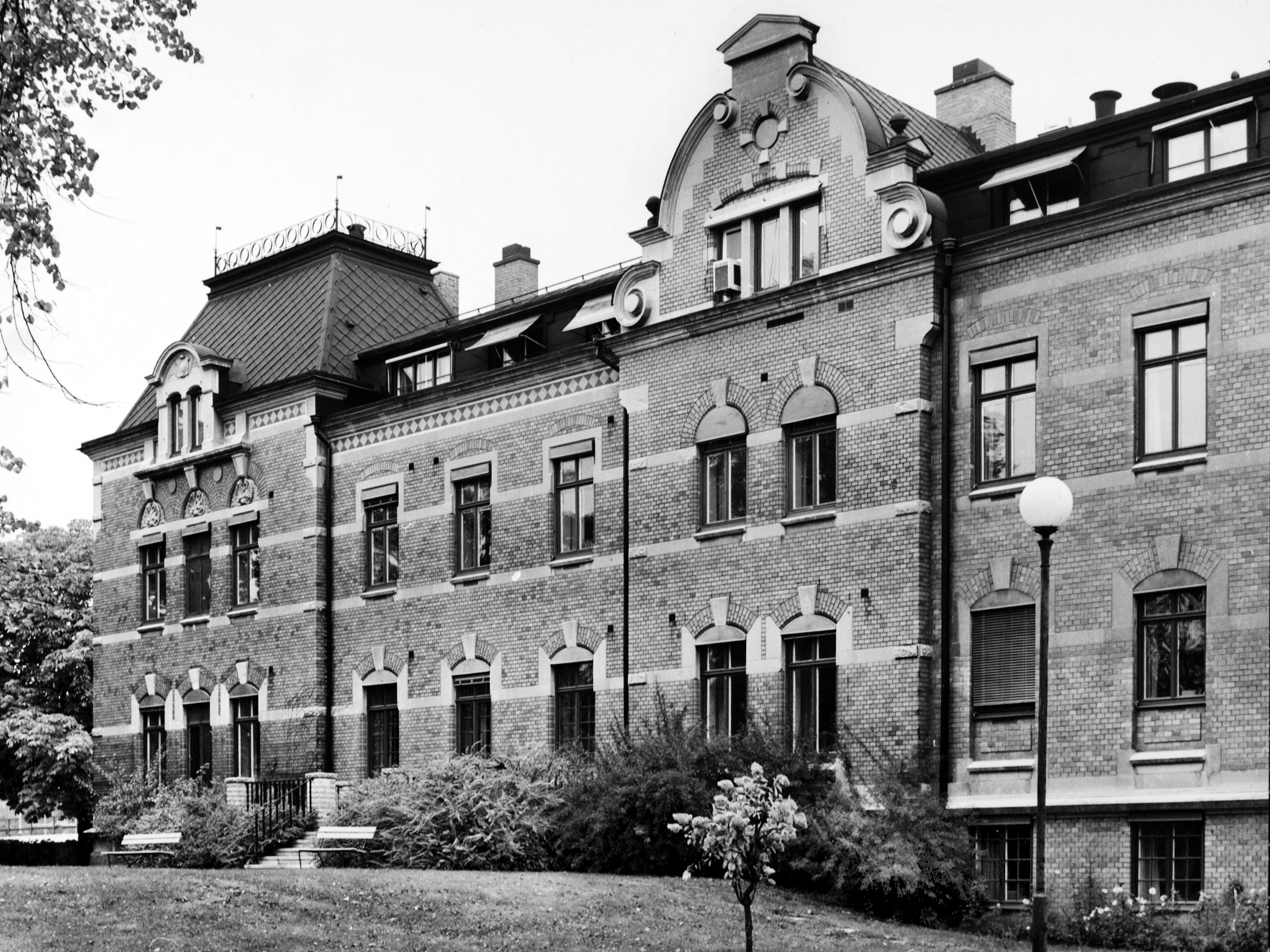 The initiative and a donation came from engineer E. L. Albert "to alleviate the illness and suffering of fellow human beings". Albert designed Strömslund, Sweden's first planned residential area. National romantic style with features from the Middle Ages and the Renaissance. Architect A. E. Kumlien designed the extension, which was completed in 1932.